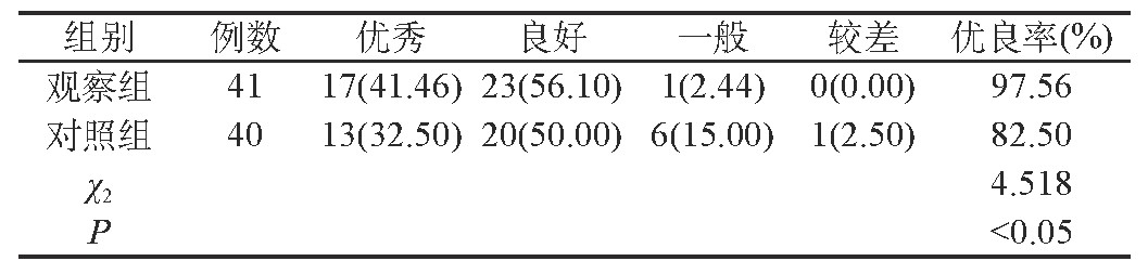 觀察組優(yōu)良率97.50%,對(duì)照組優(yōu)良率82.50%,觀察組患者保乳術(shù)美容效果優(yōu)于對(duì)照組,差異有統(tǒng)計(jì)學(xué)意義(P<0.05)。見表1。