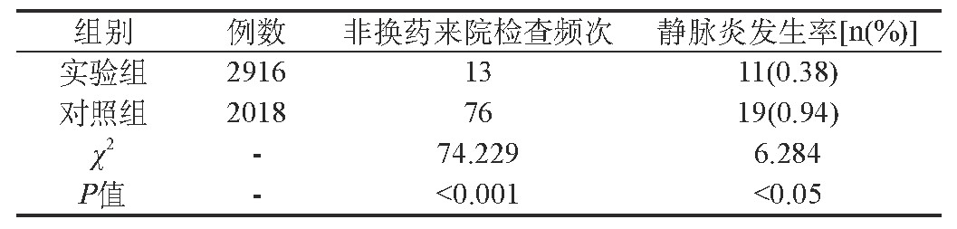 表1兩組患者非換藥來院檢查頻次、靜脈炎發(fā)生率的比較