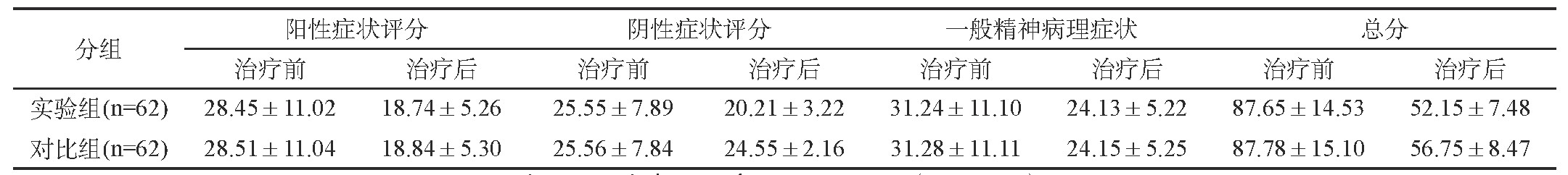 治療前兩組PANSS評分比較,差異無統(tǒng)計學意義(P>0.05);治療后,實驗組陰性癥狀、總分均低于對比組,差異具有統(tǒng)計學意義(P<0.05)。見表1。