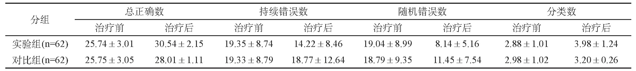 治療前兩組患者的WCST評分比較,差異無統(tǒng)計學意義(P>0.05);經(jīng)治療后,實驗組總正確數(shù)、持續(xù)錯誤數(shù)、隨機錯誤數(shù)和分類數(shù)評分均優(yōu)于對比組,差異具有統(tǒng)計學意義(P<0.05),見表2。