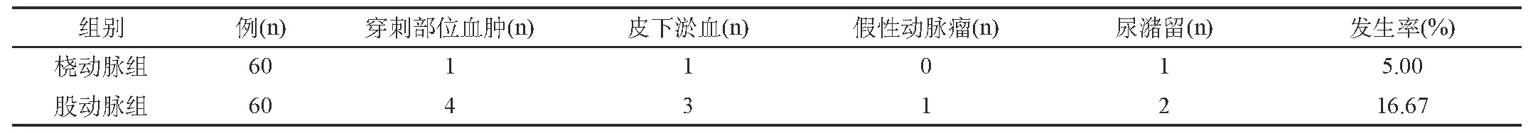 橈動(dòng)脈組術(shù)后并發(fā)癥發(fā)生率為5.00%,明顯低于股動(dòng)脈組的16.67%,差異具有統(tǒng)計(jì)學(xué)意義(P<0.05)。見表2。