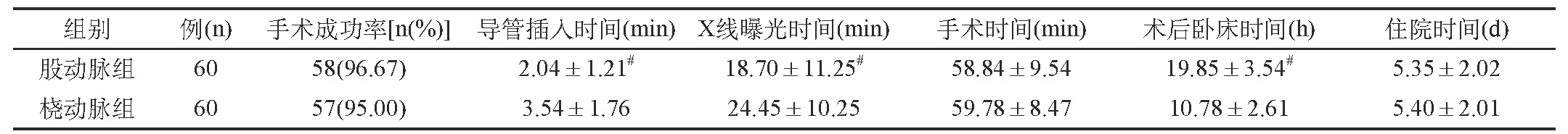 兩組手術(shù)成功率、手術(shù)時(shí)間、住院時(shí)間比較,差異無統(tǒng)計(jì)學(xué)意義(P>0.05);股動(dòng)脈組導(dǎo)管插入時(shí)間、X線曝光時(shí)間短于橈動(dòng)脈組,P<0.05;橈動(dòng)脈組術(shù)后臥床時(shí)間明顯短于股動(dòng)脈組,P<0.05。見表1。