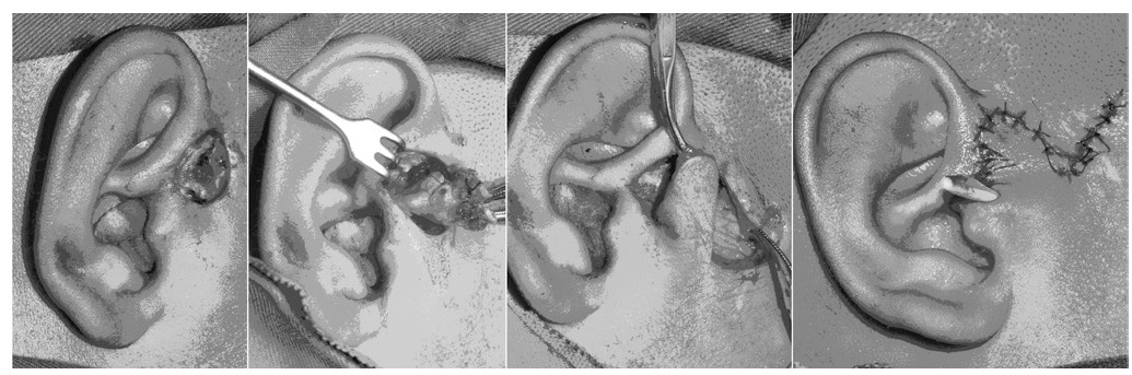 先天性耳前瘺管根據(jù)其組織胚胎來源,常發(fā)生于顳淺筋膜和深達(dá)耳廓軟骨膜層面的皮下組織內(nèi)前方軟組織內(nèi)。內(nèi)有顳淺血管和耳顳神經(jīng),余無重要的神經(jīng)和血管,也不毗鄰重要器官,對顳淺動(dòng)脈、耳顳神經(jīng)結(jié)扎或出現(xiàn)損傷時(shí),將不會(huì)明顯影響頭面部的血供和顏面部肌肉的運(yùn)動(dòng)。我們采用以顳淺筋膜、耳輪軟骨骨膜分別為后界、內(nèi)界,發(fā)跡線內(nèi)為前上界的耳前組織整塊切除治療,沿著筋膜淺面實(shí)施銳性分離,顳淺血管作為標(biāo)志,進(jìn)而可以防止對肌肉、下頜關(guān)節(jié)造成損傷[6],暴露目標(biāo)為耳輪腳軟骨,此處為瘺管的“根”,耳前瘺管感染后往往前下方接近面部炎癥種,瘺管根部炎癥往往較清,所以術(shù)中徹底切除部分耳輪軟骨,切掉“根蒂”尤為重要,但切除后術(shù)區(qū)會(huì)形成大面積的缺損,直接縫合張力大,縫合困難。