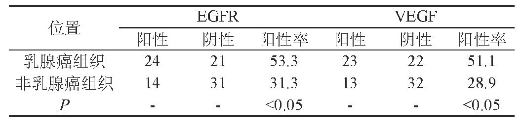 經(jīng)過(guò)相關(guān)病理分析之后乳腺癌組織中EGFR、VEGF的表達(dá)量明顯高于非乳腺癌組織中,P<0.05,見(jiàn)表1。