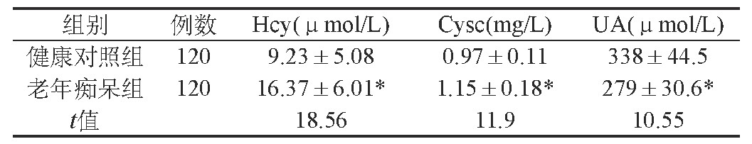 表1數(shù)據(jù)顯示,老年癡呆患者血清Hcy、Cysc水平高于健康人群,由此可以發(fā)現(xiàn)老年癡呆疾病的發(fā)生與機體內(nèi)Hcy和Cysc的水平的升高有一定的關(guān)聯(lián);老年癡呆患者血清UA水平低于健康人群,由此可見,尿酸會增加老年癡呆疾病的發(fā)病概率。