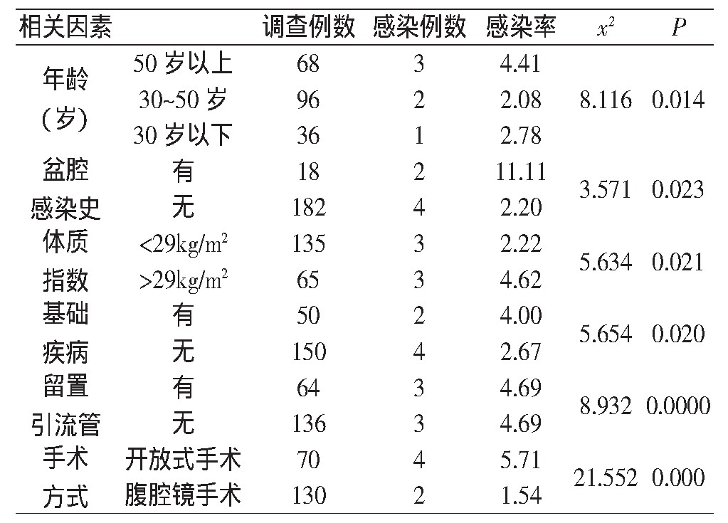 將2016年10月至2018年10月期間我院收治的200例采取手術(shù)治療的婦科疾病患者納入此次研究,其中30歲以下患者36例,所占比例為18.00%,30~50歲患者96例,所占比例為48.00%,50歲以上患者68例,所占比例34.00%;135例患者體質(zhì)指數(shù)<29kg/m2,所占比例67.50%,65例患者體質(zhì)指數(shù)>29kg/m2,所占比例32.50%,18例患者存在盆腔感染史,所占比例為9.00%,182例無(wú)盆腔感染史,所占比例為91.00%;50例患者存在基礎(chǔ)疾病,所占比例為25.00%,150患者無(wú)基礎(chǔ)疾病,所占比例為75.00%;64例患者有留置引流管,所占比例為32.00%,136例患者未留置引流管,所占比例為68.00%;70例患者選擇開放式手術(shù),所占比例為35.00%;130例患者選擇腹腔鏡手術(shù),所占比例為65.00%。