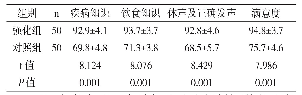 3.2 強化健康教育模式能有效提高聲帶息肉摘除術(shù)后治療效果及滿意度