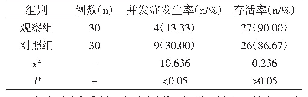 表1 患者術(shù)后并發(fā)癥發(fā)生率、存活率